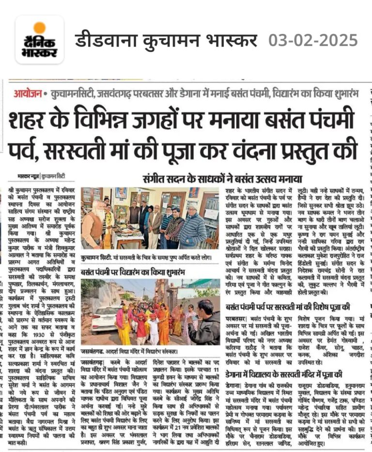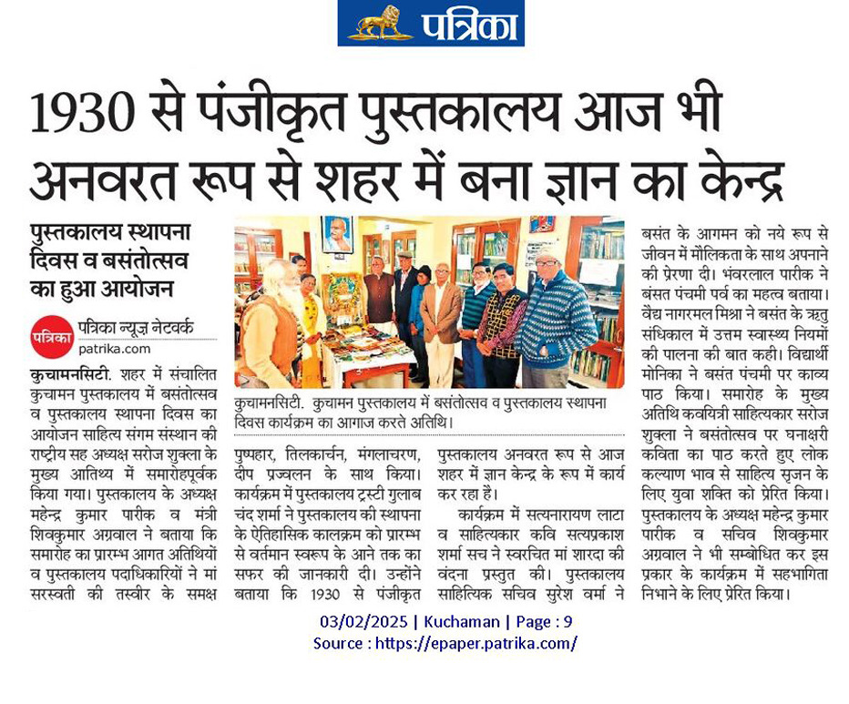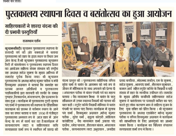 कुचामन पुस्तकालय स्थापना के शताब्दी वर्ष की ओर वक्ताओं ने बताया पुस्तकालय को शहर के हृदय स्थल पर स्थित जन ज्ञान केन्द्र है। श्री कुचामन पुस्तकालय कुचामन सिटी में बंसतोत्सव व पुस्तकालय स्थापना दिवस का आयोजन साहित्य संगम संस्थान की राष्ट्रीय सह अध्यक्षा सरोज शुक्ला के मुख्य आतिथ्य में समारोह पूर्वक किया गया।